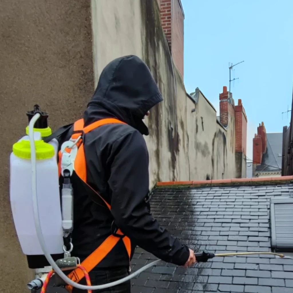 L’antimousse agit en profondeur pour détruire les racines microscopiques et ralentir la repousse. Il est généralement appliqué après un nettoyage de toiture, afin d’assainir durablement la surface.